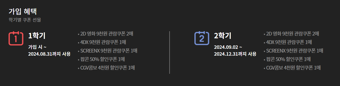 - 가입 혜택 : 1학기 (2D,4DX, SCREENX) 9천 원 영화관람쿠폰 3매 + 팝콘 50% + 콤보 4천 원 할인 1매